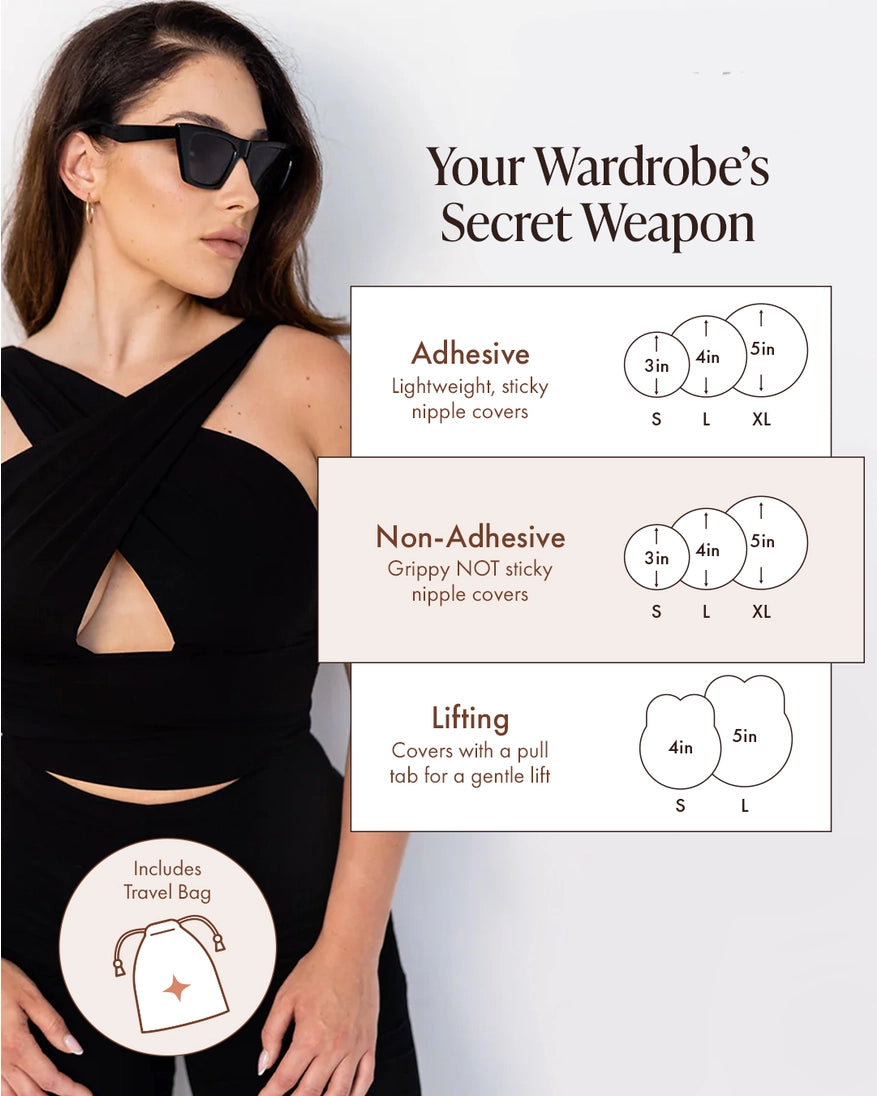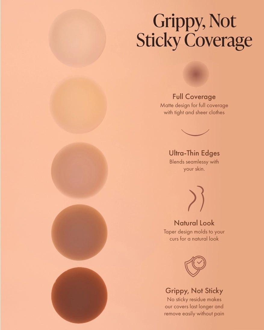 Invisible "Grippy, Not Sticky" Non-Adhesive Nipple Covers. Our "Grippy, Not Sticky" Nipple Covers are the perfect option if you don't like the stickiness of regular nipple covers. They stay using your own body heat and are best worn with tight-fitting clothes to ensure they stay in place.