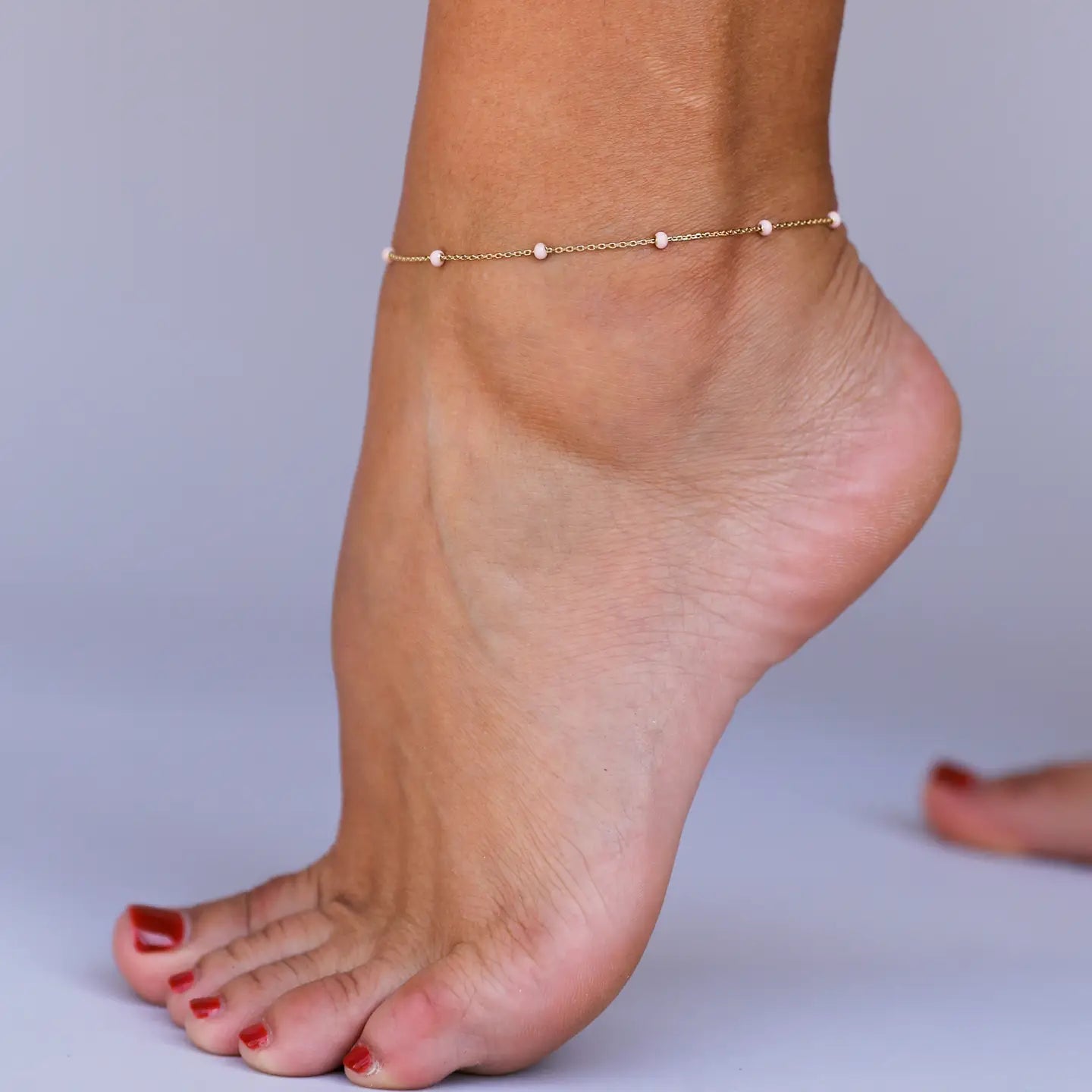 Not your average enamel anklet! This anklet was hand crafted with our diamond cut chain to add a pop of sparkle. Each enamel ball is meticulously hand painted making each piece unique. Our custom design process makes these pieces unique only to JaxKelly. Tarnish Free - Long lasting protective coating safeguarding your jewelry from sweat, water, and more. 5x more gold that standard 18k gold plating over brass Hypoallergenic – Lead Free Pink Hand Painted Enamel Adjustable 8in to 10in